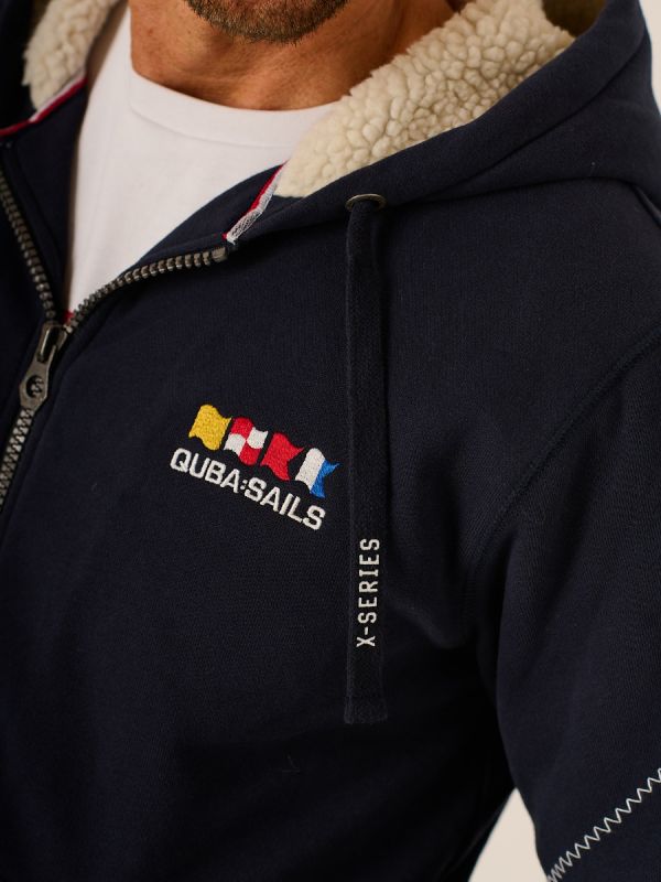 The Ruperto hoody combines functional details with Quba & Co’s signature nautical style. It features front pockets for everyday convenience, an embroidered flag logo on the chest, a bold printed Quba & Co logo on the back, and an embroidered number detail on the sleeve. The design is completed with embroidered coordinate details along the hood trim, celebrating Quba’s maritime heritage.